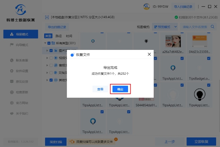 6. 數據恢復成功后,只需點擊“確定”,這樣數據恢復操作就成功完成了。