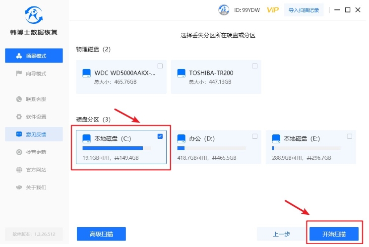 2. 明確需要恢復數據所在的分區,確認無誤后,點擊“開始掃描”按鈕,開始進行數據掃描。