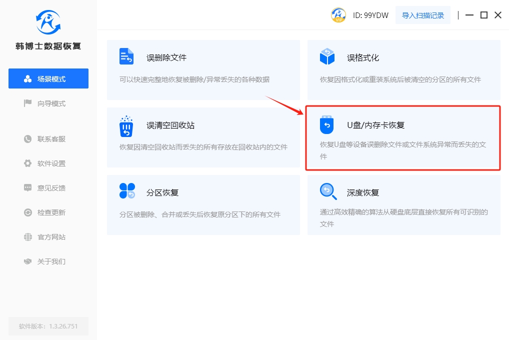 1. 先下載好韓博士數據恢復軟件到電腦桌面,然后雙擊啟動,點擊“場景模式”,選擇“U盤/內存卡恢復”。
