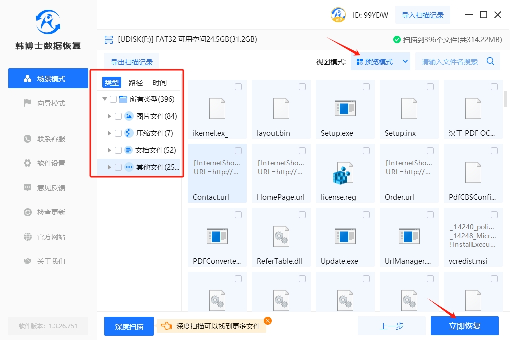 4. 掃描完成后,可以使用“預(yù)覽模式”來確認(rèn)文件是否正確無誤。確認(rèn)后,再勾選需要恢復(fù)的文件,然后點擊“立即恢復(fù)”。