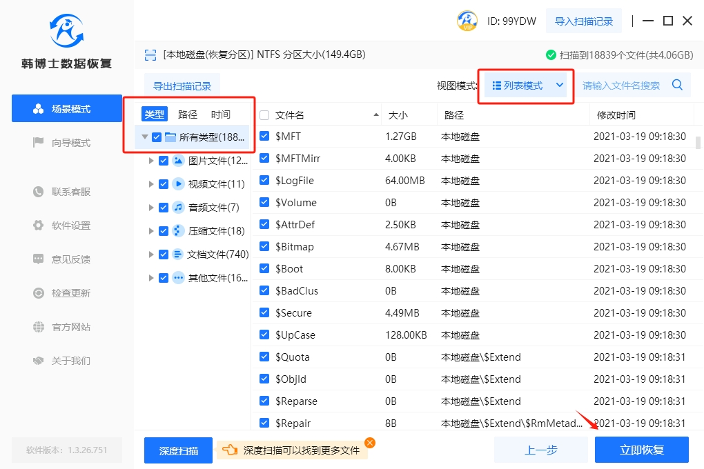 3. 韓博士正在掃描文件,請耐心點。掃描完成后,選中要恢復的文件,然后單擊“立即恢復”按鈕,完成數據恢復過程。