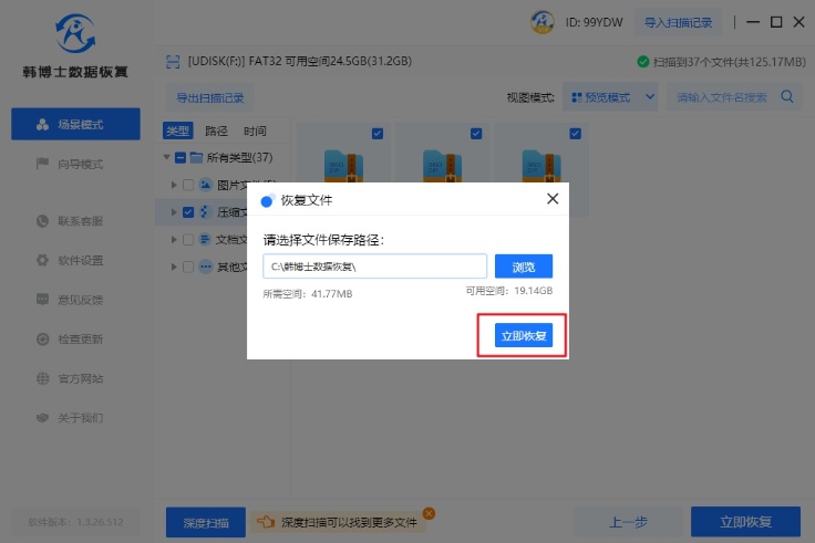 4. 掃描完成后,可立即使用“預覽模式”,來確認文件是否正確無誤。確認好之后,再勾選需要恢復的文件,然后點擊“立即恢復”。