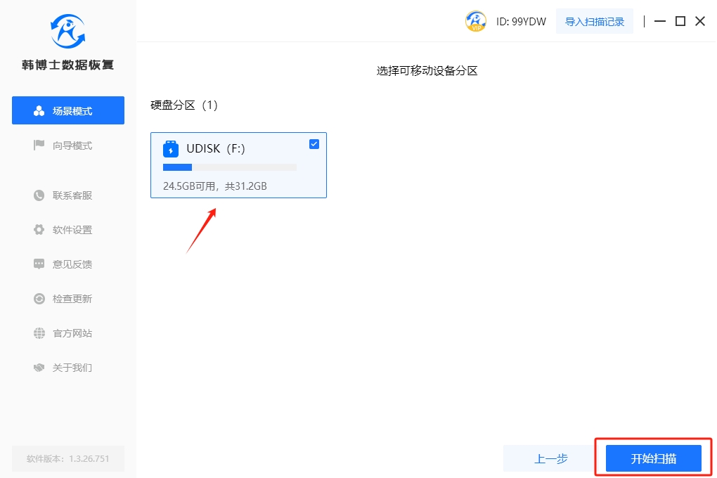 1. 開始恢復前,請先將韓博士數據恢復軟件下載到桌面,并雙擊打開。接著,在界面中找到“場景模式”,然后選擇“U盤/內存卡恢復”。這樣,您就可以開始進行SD卡的數據恢復了。