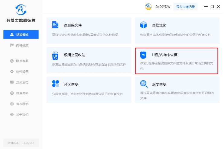 1. 首先,雙擊打開桌面上下載好的韓博士數據恢復。然后,您需要在軟件界面中找到“場景模式”,并選擇其中的“U盤/內存卡恢復”選項。這樣,您就可以順利進入文件恢復的流程了。