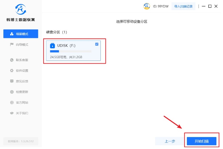 1. 雙擊打開桌面上下載好的韓博士數據恢復,接著在“場景模式”中選擇“U盤/內存卡恢復”,進入文件恢復流程。