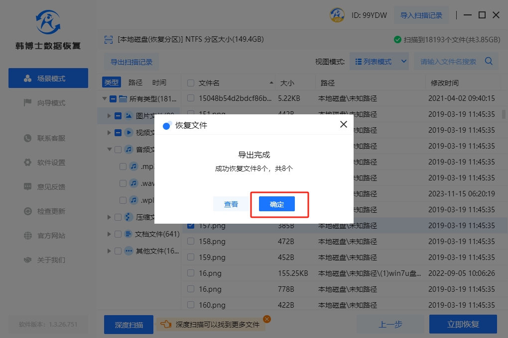 3. 韓博士進行數(shù)據(jù)的掃描操作,這一過程無需您手動操作,只需等待掃描成功即可。掃描完成后,請選擇您需要恢復(fù)的文件,然后點擊“立即恢復(fù)”