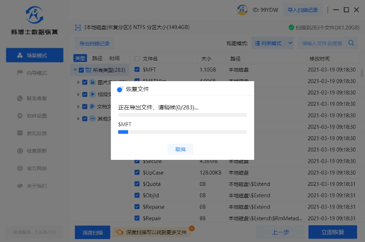 3. 韓博士進行數據的掃描操作,這一過程無需您手動操作,只需等待掃描成功即可。掃描完成后,請選擇您需要恢復的文件,然后點擊“立即恢復”