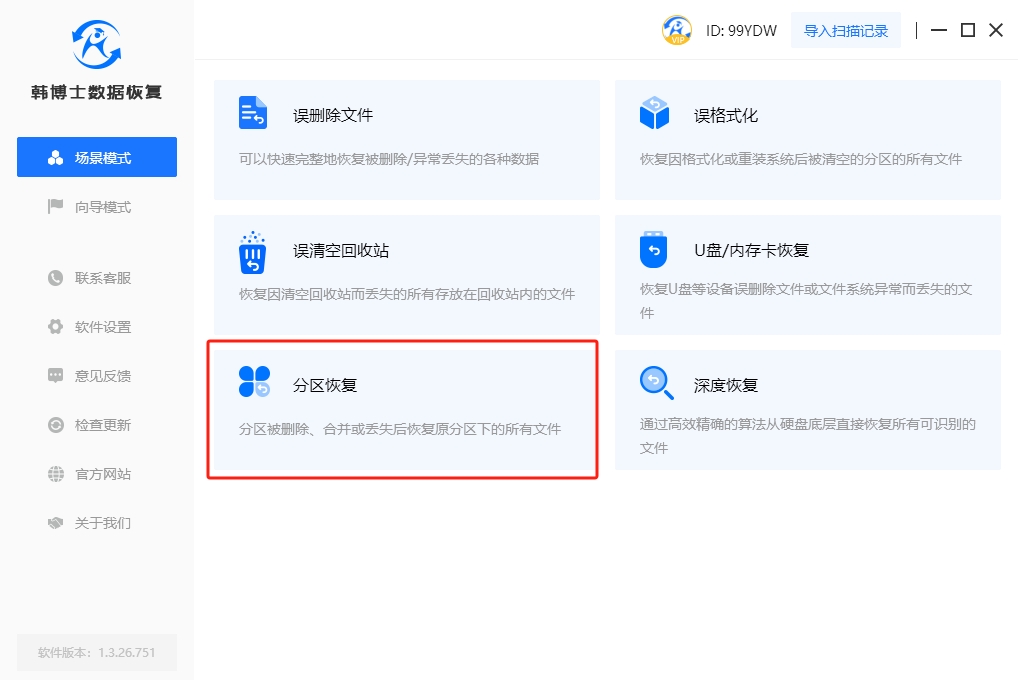 1. 在進入了韓博士數據恢復軟件后,切換到場景模式,選擇“分區恢復”來執行適當的數據恢復任務。