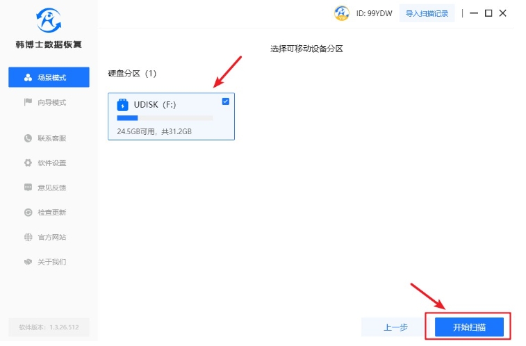 1. 下載并運行韓博士數據恢復,隨后點擊“場景模式”,選擇“U盤/內存卡恢復”以進行相應的操作。