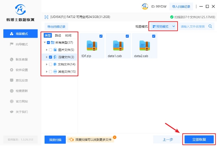 4. 數據掃描好了之后,通過下方的“預覽模式”來預覽文件,之后選擇要進行恢復的文件,點擊“立即恢復”就可以了。