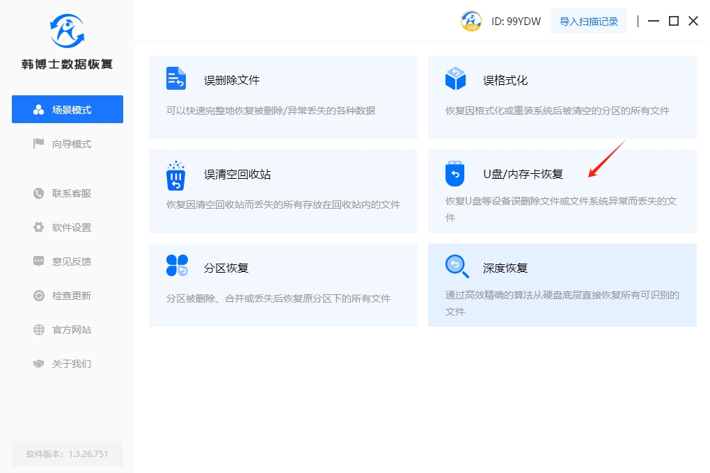 1. 打開韓博士數據恢復軟件,這是內存卡數據恢復的必要步驟。然后,在軟件界面中找到“場景模式”,點擊“U盤/內存卡恢復”。