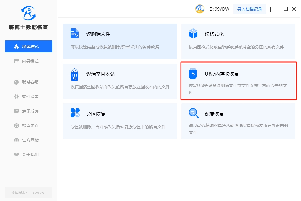 1. 要執行數據恢復操作,首先雙擊打開韓博士,進入軟件界面,然后找到“場景模式”,選擇“U盤/內存卡恢復”。