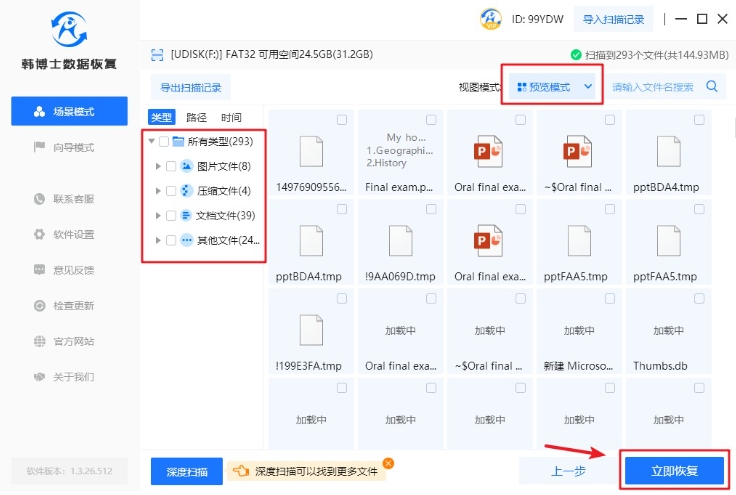 4. 掃描完成后,您可以通過“預覽模式”來確認文件是否正確,接下來選擇需要恢復的文件,選好后再點擊“立即恢復”。