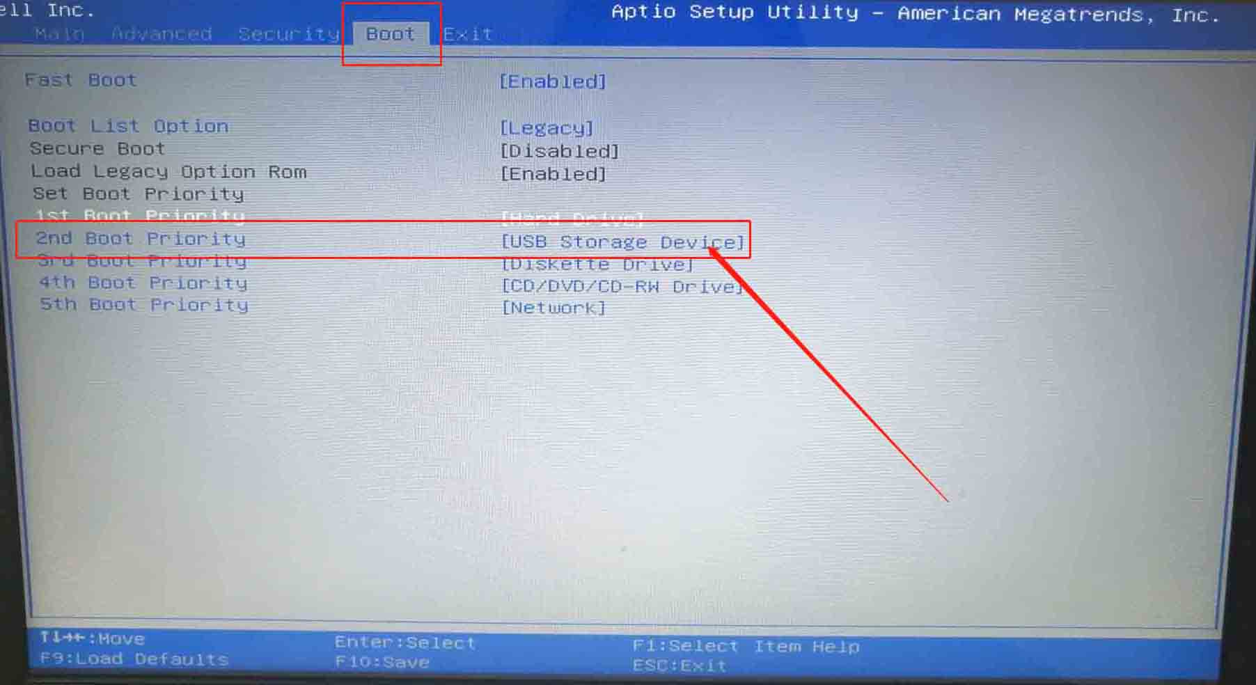 3.使用方向鍵選擇U盤設備后,使用“+”將usb選項移動至第一項并按下“F10”保存設置。
