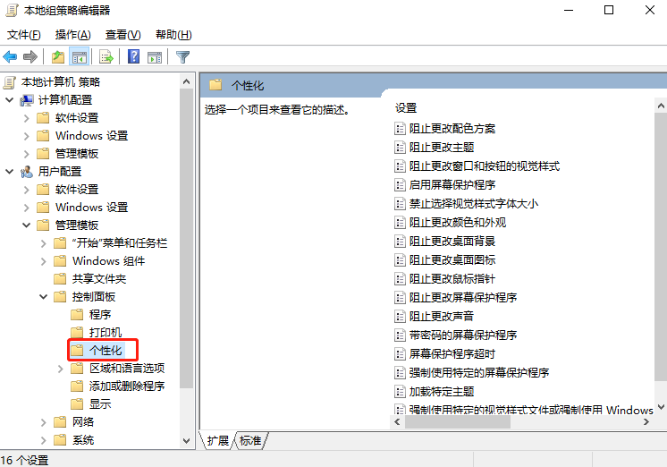 2.在打開的本地組編輯器界面中依次展開以下路徑:用戶配置-管理模板-控制面板-個性化。