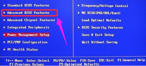 2.開始在打開的bios界面中使用方向鍵選擇“Advanced BIOS Features”回車進入。