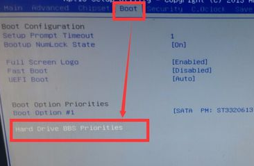 3.出現開機界面時不斷按下快捷鍵進入bios設置界面,直接使用方向鍵切換到boot選項,找到“Hard Drive BBS Priorities”選項。