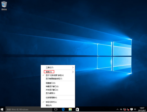 1.鼠標右鍵點擊win10系統任務欄空白處,隨后選中其中的“搜索”選項。