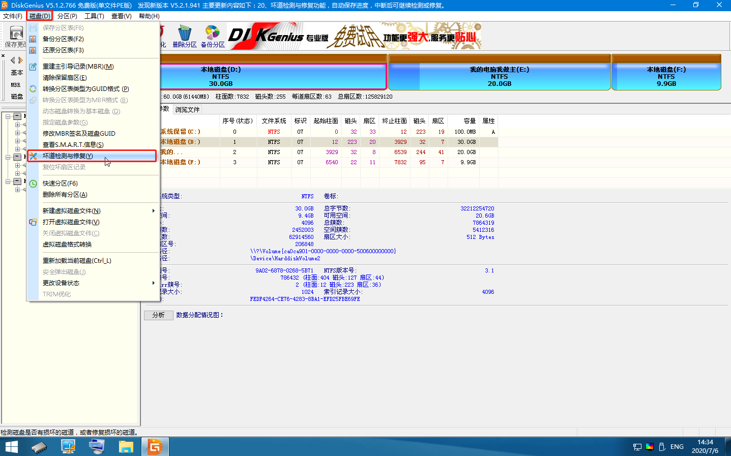 4.打開桌面上的分區工具,選中分區表壞了的硬盤,開始進行“壞道檢測與修復”。