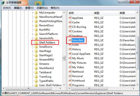 HKEY_CURRENT_USER \Software\Microsoft\Windows\CurrentVersion\Explorer\Shell Folders,隨后在界面中雙擊打開Favorites選項,如圖所示: