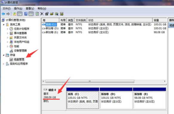 2.點擊磁盤管理時,大家就可以看到硬盤的相關(guān)信息。