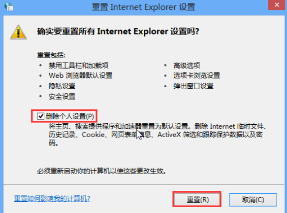 3.在彈出的重置窗口中勾選以下復選框,最后點擊重置。