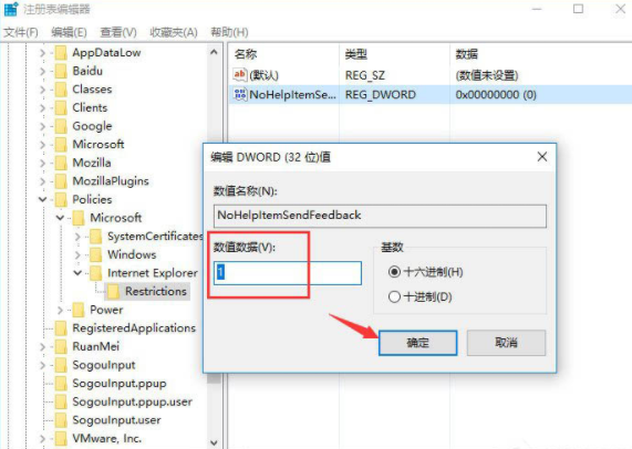 2.如果找不到對應選項,如果找不到對應的選項,可以直接右鍵Restrictions開始新建DWORD(32位)值,將其命名為NoHelpItemSendFeedback。
