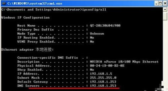 6.開始設置自己ip避開該規則,首先進行查看自己的ip跟DNS,打開以下界面,輸入命令ipconfig/all回車查看DNS地址。
