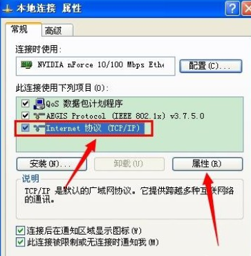 7.打開本地連接屬性,選擇Internet協議并點擊屬性進入。