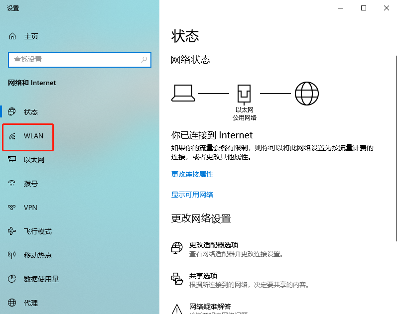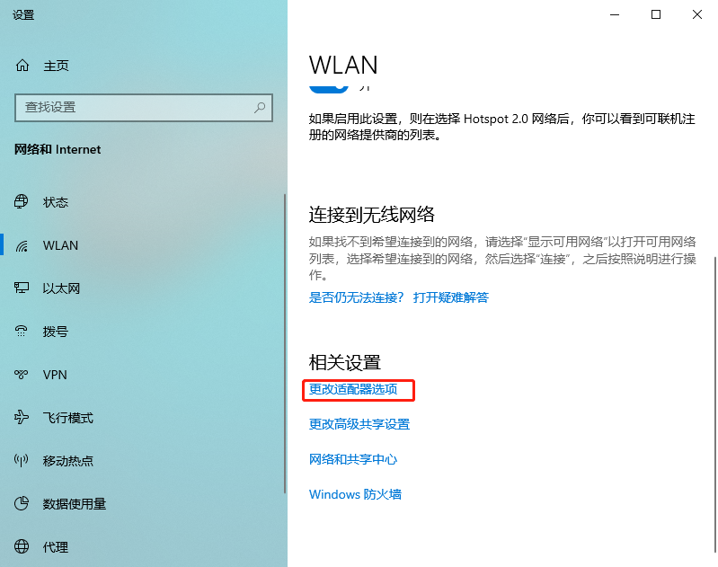 然后在新的界面里找到并點擊”WLAN“選項,在右邊找到“更改適配器選項”并點擊。