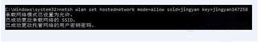 ?在彈出來的命令提示符中輸入:netsh wlan set hostednetwork mode=allow ssid(無線熱點名稱)=jingyan key(密碼)=jingyan147258,按回車確認。