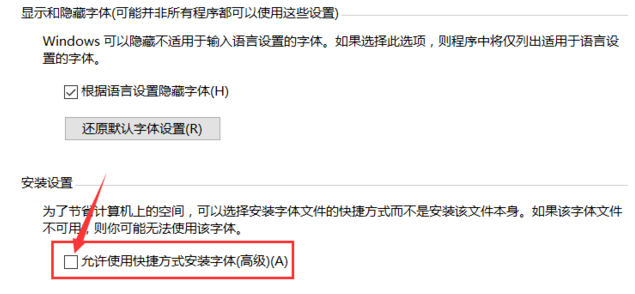 6.勾選界面下方的“允許使用快捷方式安裝字體(高級)(A)”。
