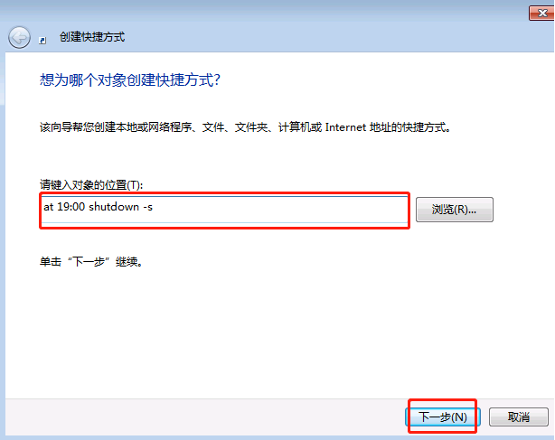 2.在彈出的對(duì)話框中輸入:at 19:00 shutdown -s,或者其他的關(guān)機(jī)時(shí)間設(shè)定。