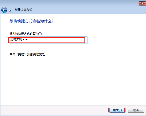 3.在以下頁面中輸入定時(shí)關(guān)機(jī).exe,點(diǎn)擊完成。