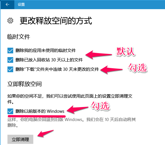 勾選:“刪除“下載”文件中連續30天未更改的文件”、“刪除以前版本的Windows”。最后點擊“立即清理”。