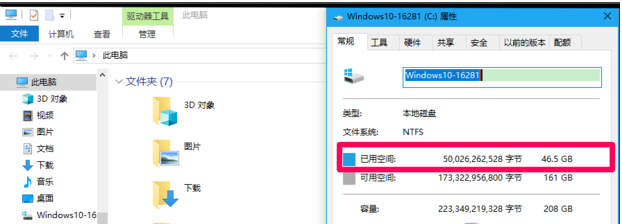 7. 進入資源管理器,右鍵點擊系統磁盤 - 屬性,可以看到已用空間為:46.5GB,已經清除了系統文件20GB左右。