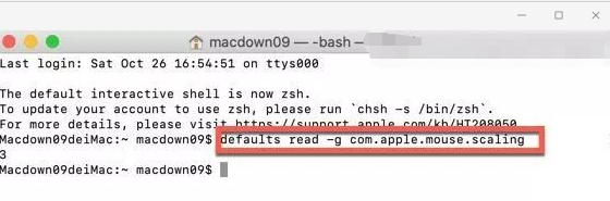 1. 打開終端對話窗口,輸入以下指令,查看鼠標當前的設置速度: