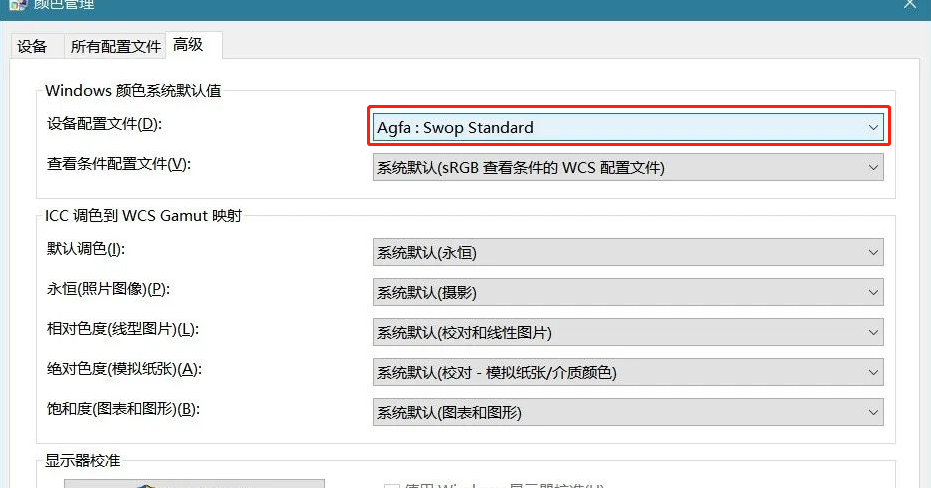 4.在高級(jí)標(biāo)簽中,點(diǎn)擊設(shè)備配置文件,選擇Agfa:Swop Sandard。