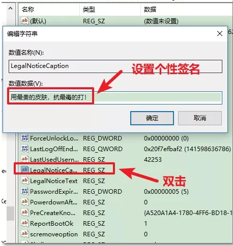 3.在右側分別雙擊【LegalNoticeCaption】和【LegalNoticeText】的兩個文件,把想要顯示在Windows登錄界面的文字依次填寫在【數值數據】中即可。