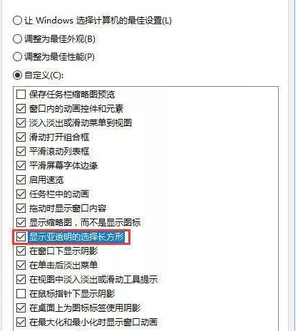 4.在性能選項界面中,在視覺效果的選項卡中,勾選“顯示亞透明的選擇長方形”,確定,確定保存設置。