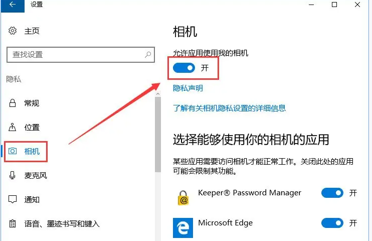 2.點擊“相機”,將有關相機的開關全部開啟即可。
