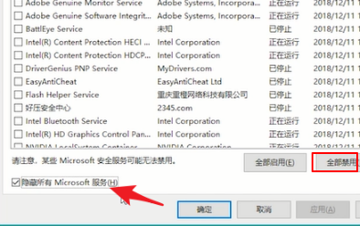 3、接著切換到“服務”選項下,勾選下方的“隱藏所有Microsoft”,點擊“全部禁用”。