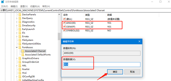 在右側可以看到“ANSI(00)”和“OEM(FF)”,將它們的數值都修改為“YES”,再點擊“確定”。