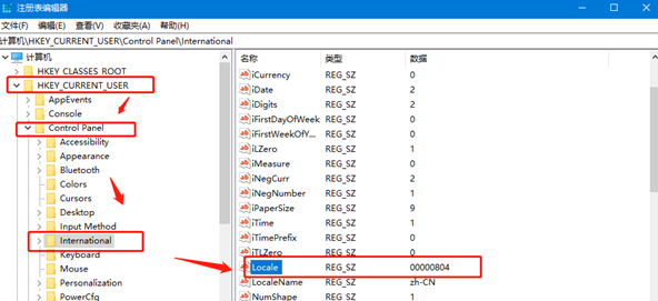 如果方法二還是沒有解決亂碼的問題,則繼續根據下圖的路徑,找到locale并且將其數值數據修改為00000804即可。
