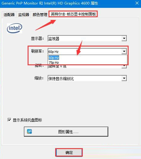 4、接下來會彈出顯示適配器的屬性窗口,小編以英特爾顯示適配器為例,切換至“英特爾核芯顯卡控制面板”,然后調整刷新率,找到合適的刷新率即可點擊“確定”。