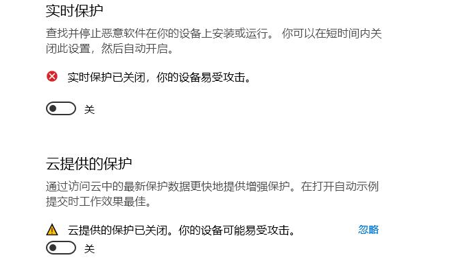 5、現在可以看到“實時保護”和“云提供的保護”是開啟的狀態,將其關閉即可。