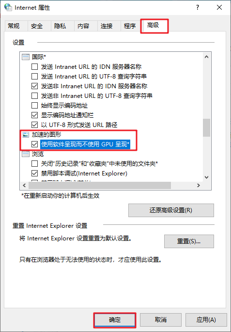 4、切換到“高級”選項卡,找到“加速的圖形”下的“使用軟件呈現而不使用GPU呈現”,打上勾,點擊“保存”即可。