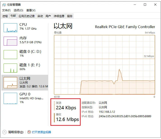 在任務管理器上選擇【性能】,然后從左側選擇“以太網”,即可在右側看到實時的網速曲線圖以及實時的網速數據。