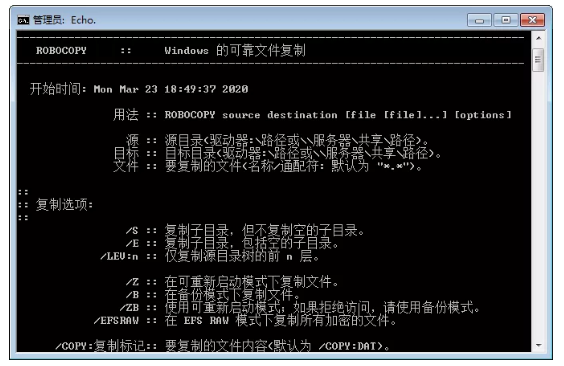 在命令行窗口中輸入命令robocopy可以查看其相應(yīng)參數(shù)說明。