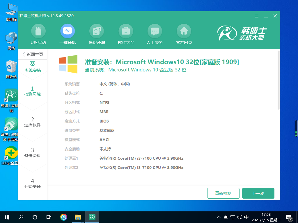 9.韓博士開始對電腦進行環境檢測,待電腦檢測完成,點擊“下一步”按鈕